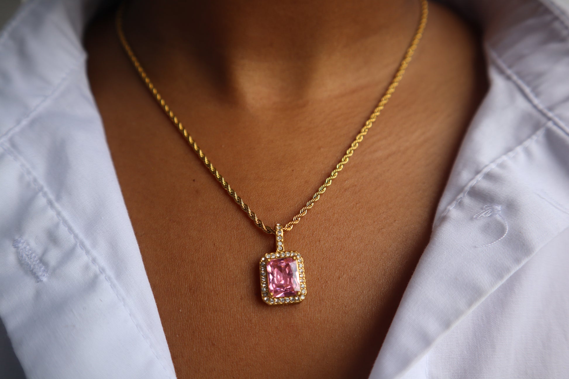 Add a touch of luxury to your wardrobe with our Gold Necklace featuring a stunning Pink Diamond Pendant. This elegant piece, crafted from high-quality stainless steel, exudes sophistication and charm. The pink diamond pendant beautifully catches the light, making this necklace a standout addition to any jewelry collection. With its tarnish-resistant and hypoallergenic properties, this necklace offers not only beauty but also long-lasting comfort. Whether you're attending a special event or adding a bit of glam to your everyday look, this necklace is the perfect accessory to elevate your style.
