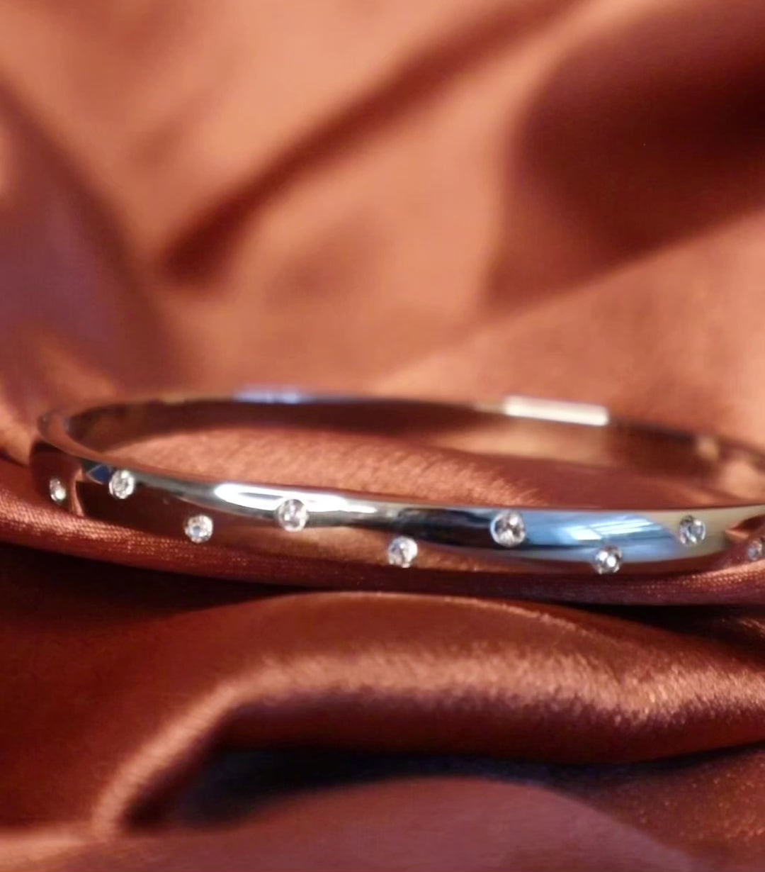 The Diamond Encrusted Silver Bangle is ideal for women who appreciate the perfect mix of elegance and modern design. Whether you're building a designer jewelry collection or looking for a statement piece to elevate your daily outfits, this bangle will not disappoint. It’s perfect for enhancing both casual and formal styles, making it an invaluable addition to your jewelry box. Wear it on its own for a subtle sparkle or stack it with other bangles for a bold statement—this beautiful piece is designed to complement your unique style for every occasion.