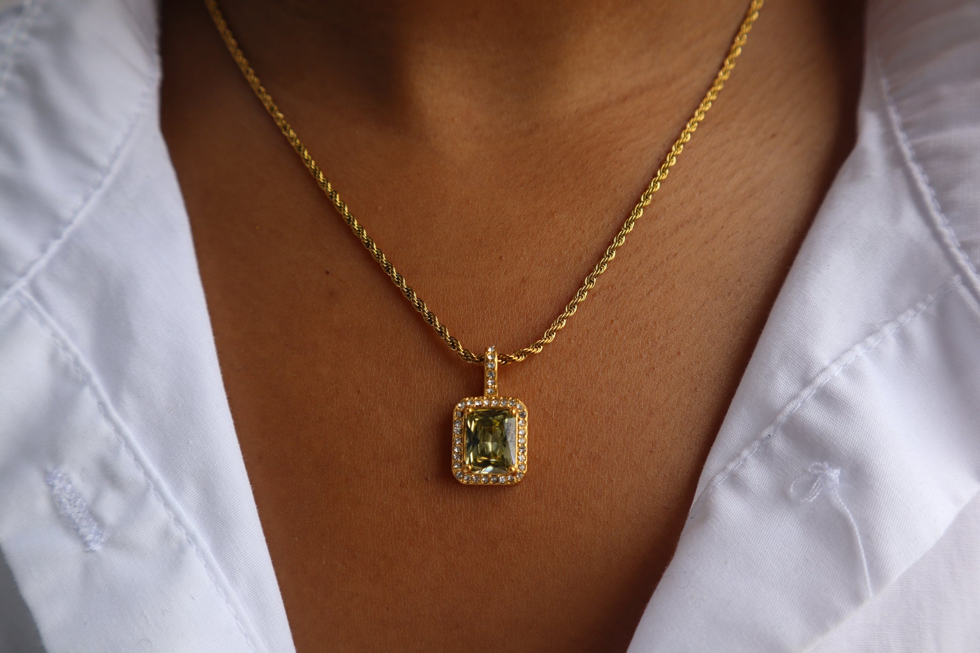 Elevate your style with our stunning Gold Necklace featuring a radiant green diamond pendant, perfect for the modern woman who values luxury and elegance. Crafted from high-quality stainless steel, this necklace is designed to last with its tarnish-resistant and hypoallergenic properties. Whether worn daily or for special occasions, this exquisite piece adds a touch of sophistication to any outfit. A must-have for any jewelry collection, this necklace blends classic beauty with contemporary design to enhance your unique style.